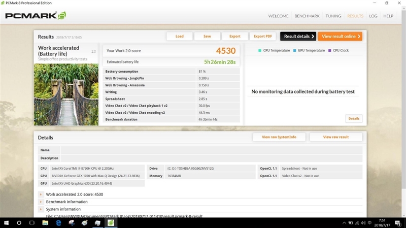 GS65内置了总容量80.25Wh的锂电池,官方宣称可以实8小时的电池续航,我们用PCMark8来检验一下。测试时关闭所有其他进程,屏幕亮度调为50%,在电源模式中选择高性能模式。